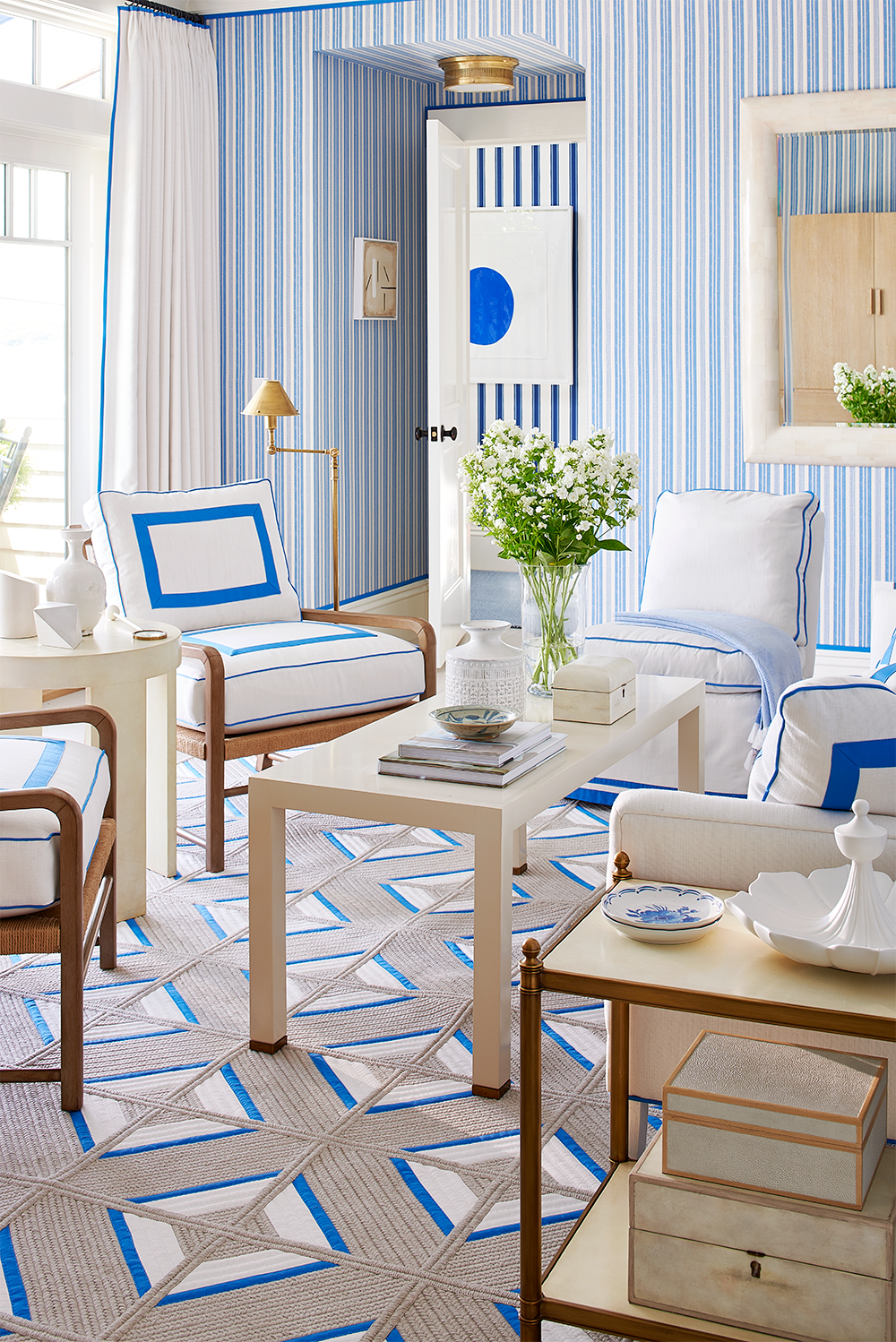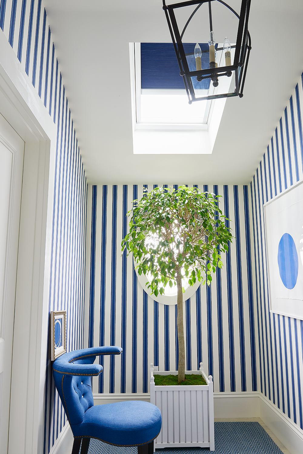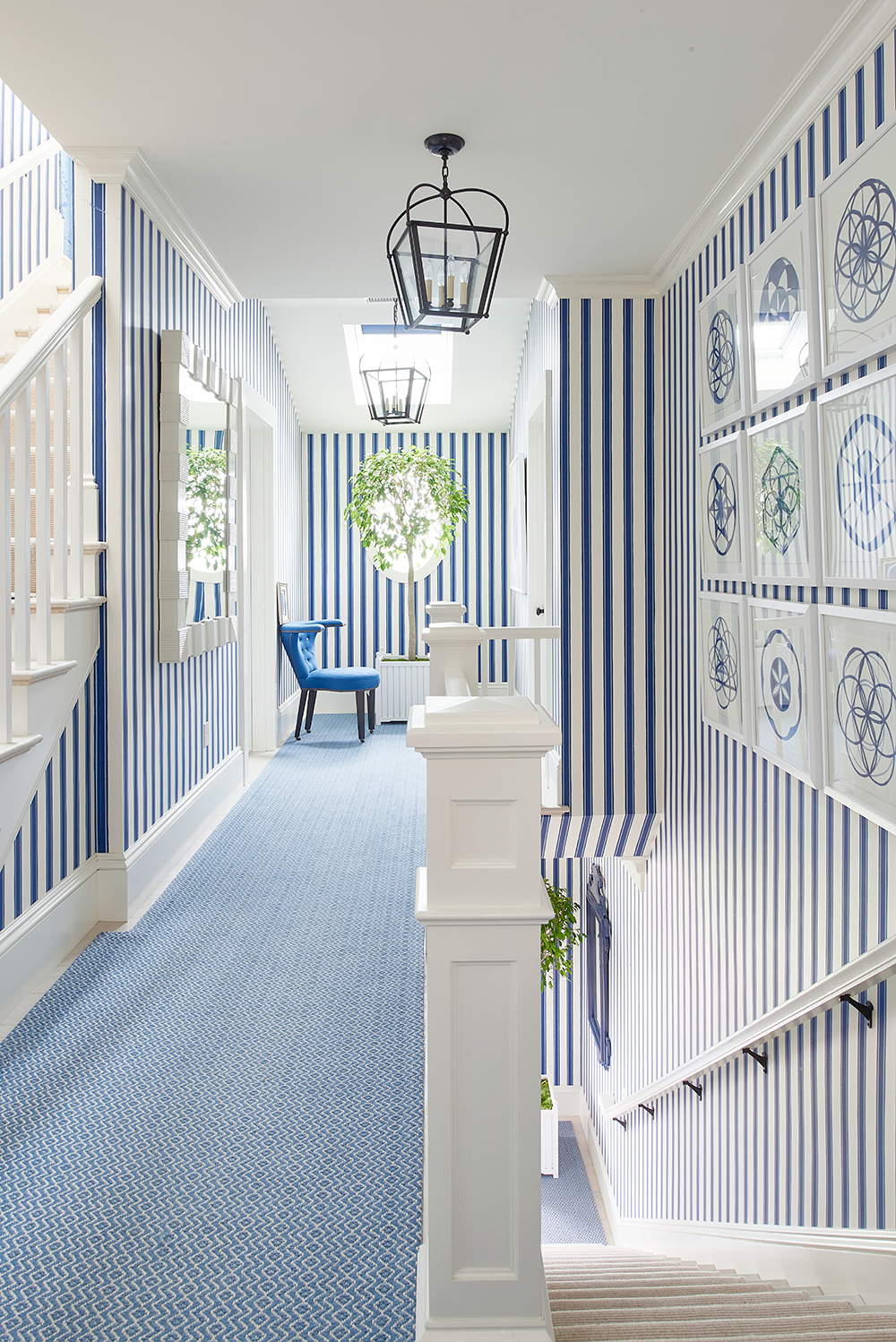Best known for his classic American style, Mark D. Sikes showcased his signature blue and white color palette throughout the home. The entry, stairway and center halls were outfitted in a custom stripe wallpaper and timeless Plantation Small Lanterns by Chapman & Myers.