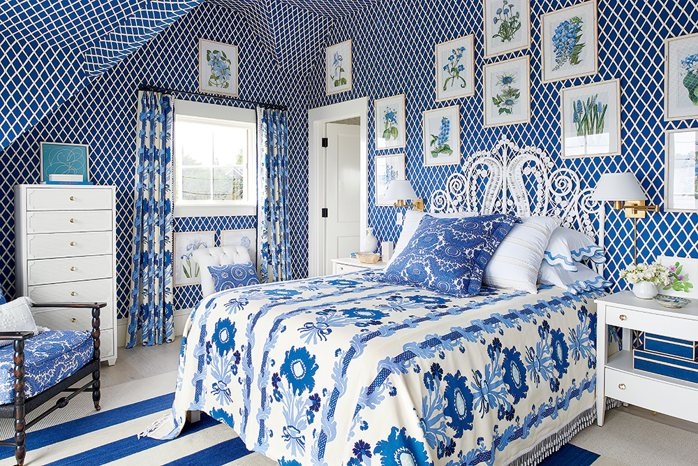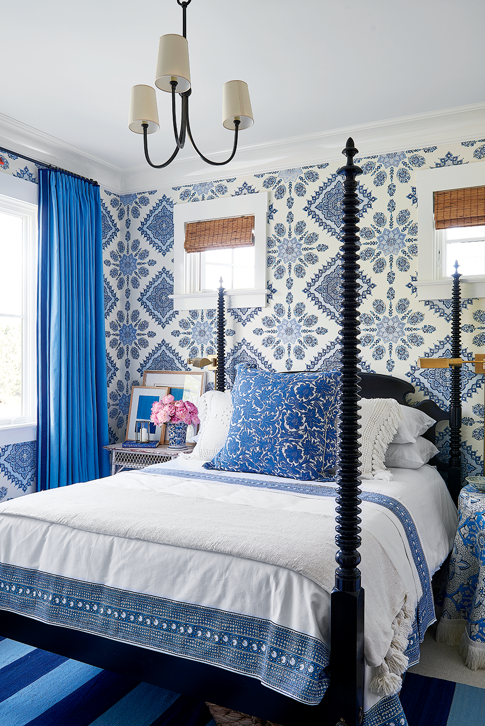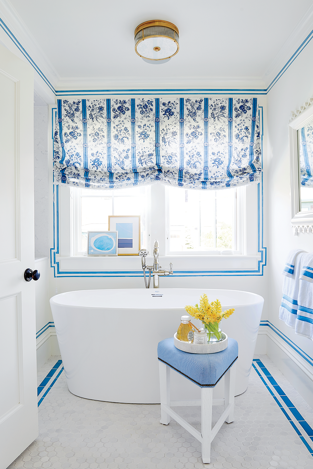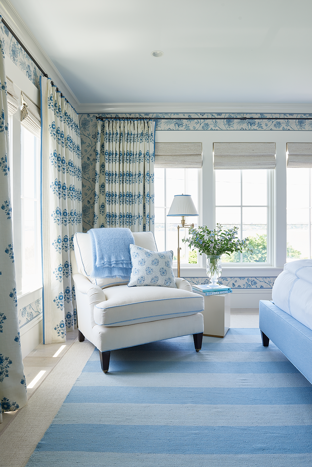 Best known for his classic American style, Mark D. Sikes showcased his signature blue and white color palette throughout the home. The entry, stairway and center halls were outfitted in a custom stripe wallpaper and timeless Plantation Small Lanterns by Chapman & Myers.