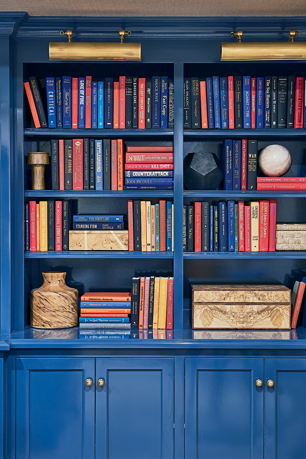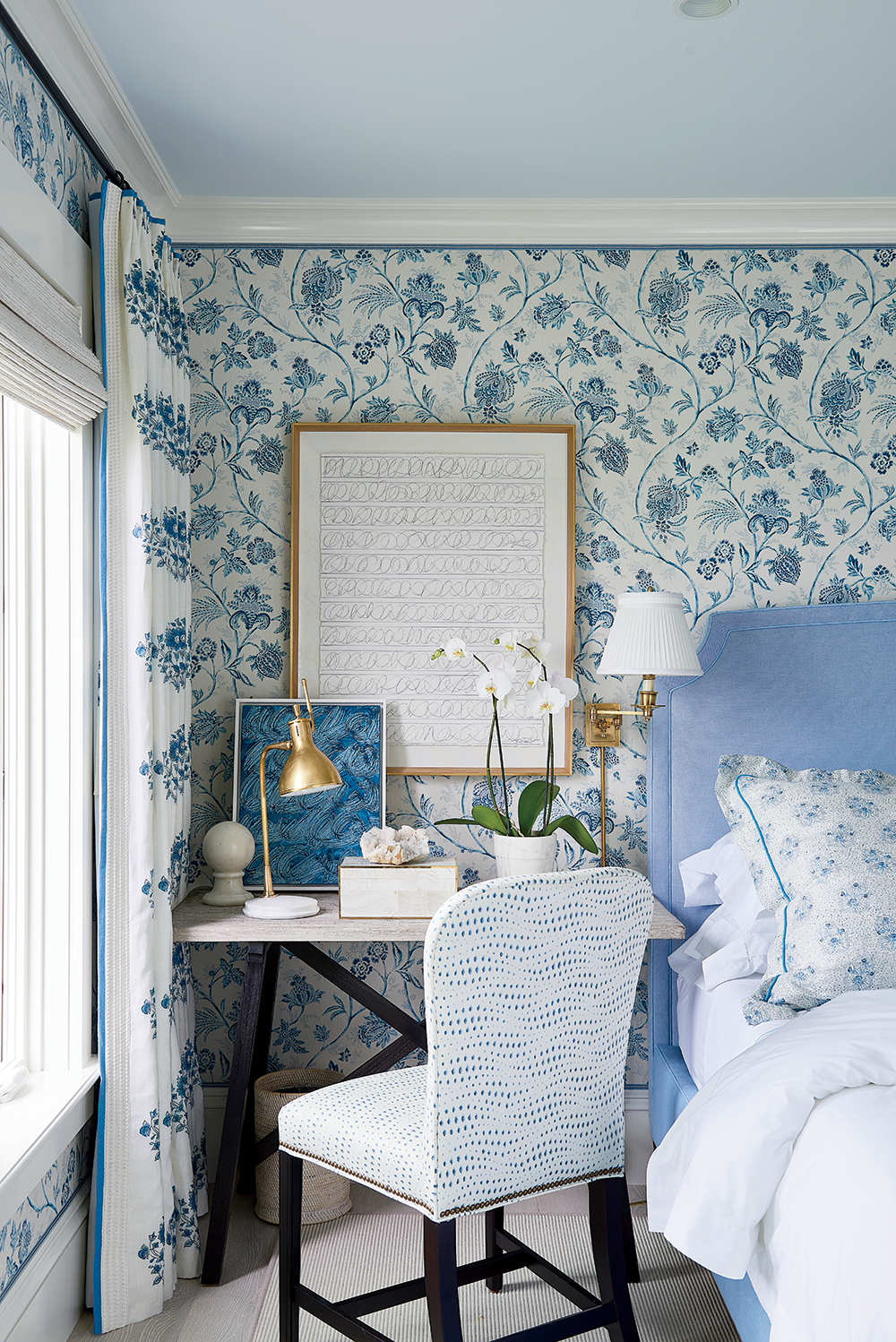 Lighter blue hues were introduced in the master bedroom and accented by warm brass lighting and framed art. The Enrico Table Lamp (discontinued) by Thomas O’Brien provides task light at the desk. A pair of Triple Swing Arm Wall Lamps by Studio VC flank the bed for evening reading.