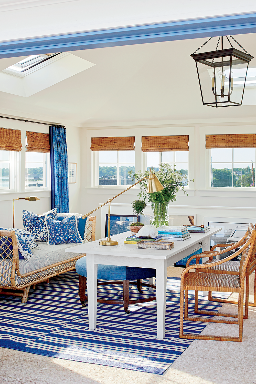 Sunlight fills the third-floor loft, where Sikes planned the home office/studio space. The Goodman Table Lamp by Thomas O’Brien sits atop a white desk and the Cornice Large Lantern by Chapman & Myers hangs from the center point of the slanted ceiling.