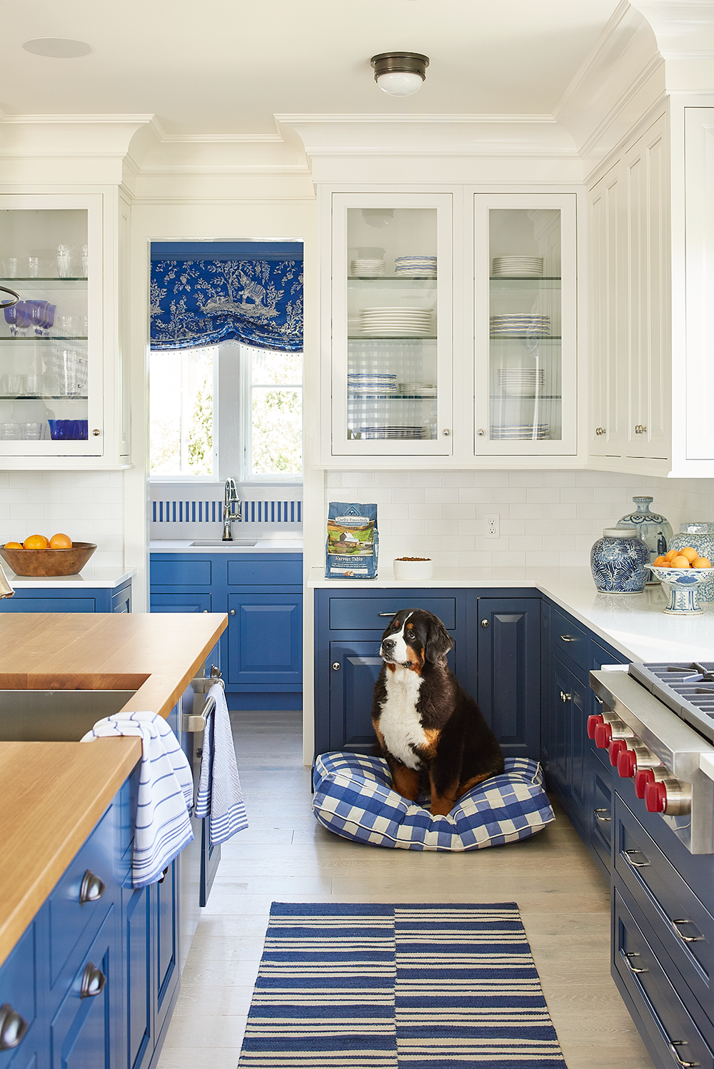 Bronze light fixtures bring casual appeal throughout the bright kitchen. Marine Medium Flush Mounts by Chapman & Myers dot the ceiling overhead while a trio of Patrick Medium Pendants by Thomas O’Brien (discontinued) light the butcher-block-topped island.