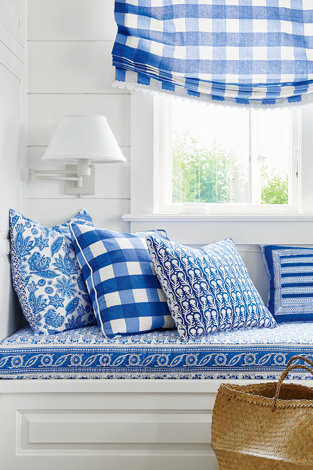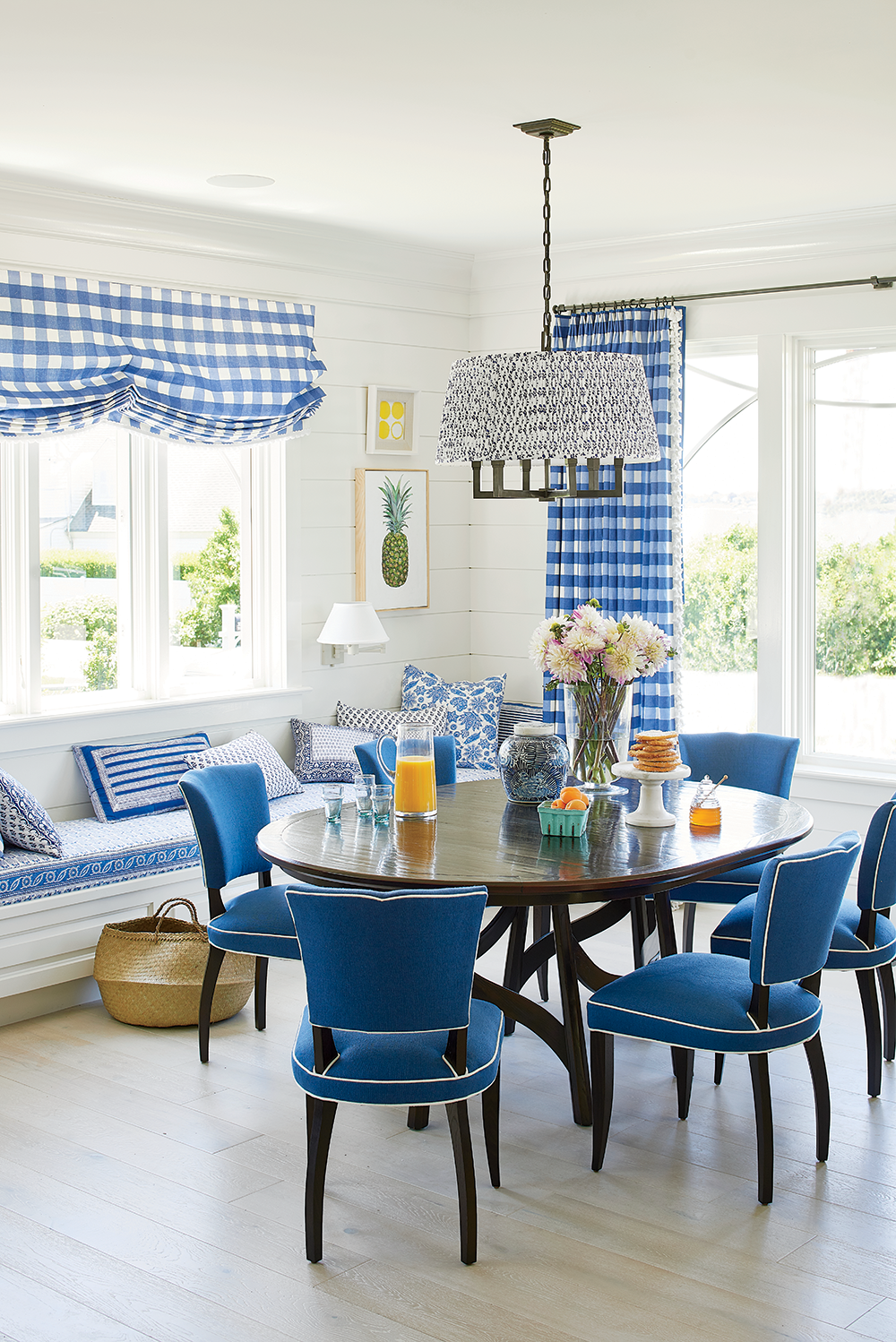 The cozy breakfast nook adjacent to the kitchen features the Square Tube Hanging Shade by Chapman & Myers with a custom patterned shade. A pair of white Classic Swing Arm Wall Lamps by Studio VC light the cushioned window seat.