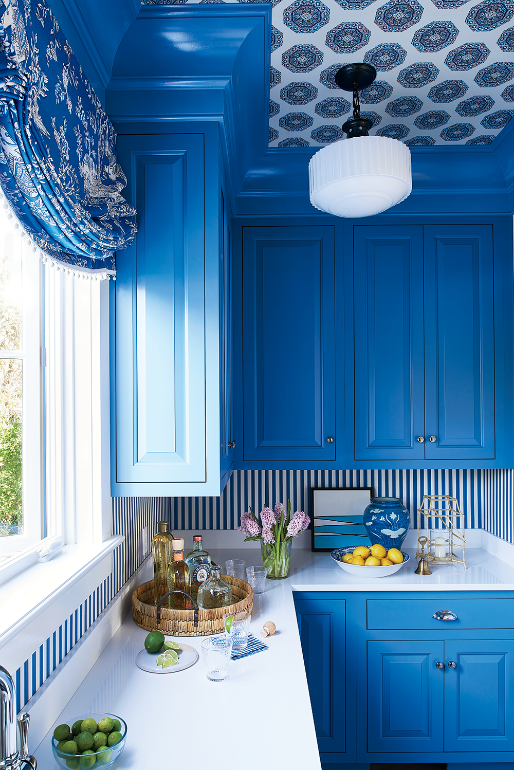Don’t forget the fifth wall! The Milton Road Flush Mount by Thomas O’Brien (installed as a pendant) complimented medallion-print wallpaper covering the ceiling of the butler’s pantry.