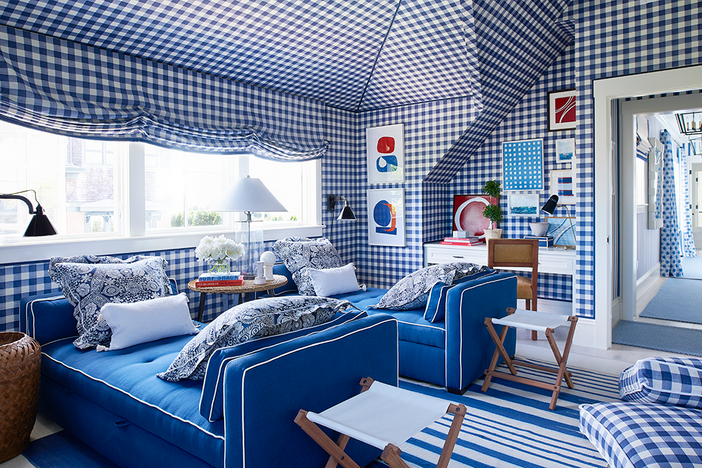 In the kids’ room, Sikes selected a buffalo check wallpaper and daybeds for a lounge-like feel. He finished with youthful artwork and lighting, including Ashcroft Sconces (discontinued) and the Modern Table Lamp by Ralph Lauren Home.