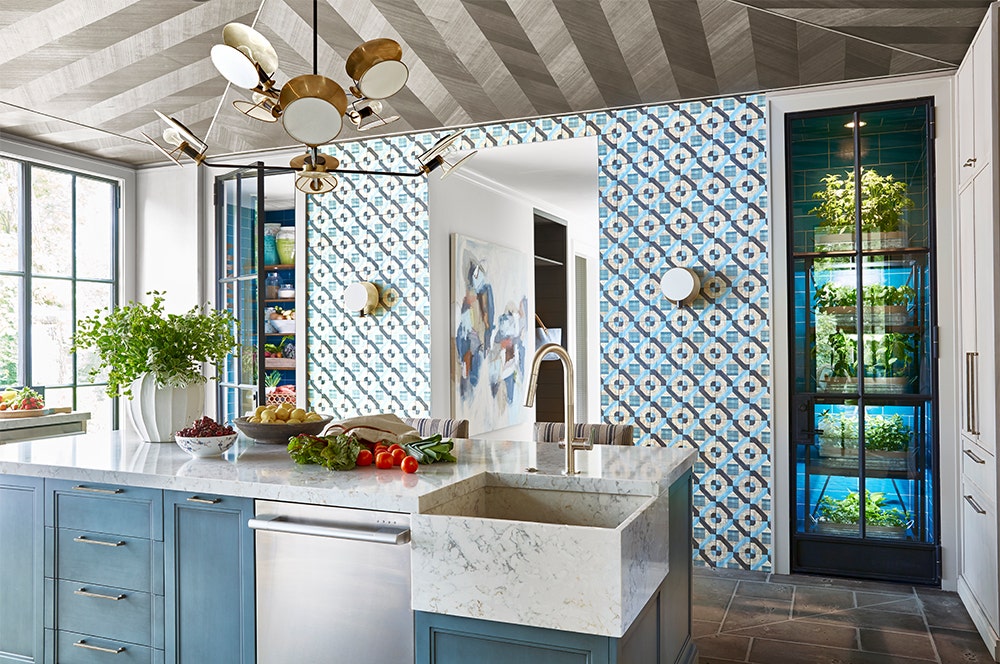 Matthew Quinn's inspiration for the kitchen was healthy and smart living. He even incorporated a grow room for fresh herbs year-round! Contemporary, geometric elements are found throughout, including the Osiris Large Reflector Chandelier and Osiris Single Reflector Sconce by Thomas O'Brien. The bright palette paves the way for a cohesive, inviting space with perfect proportions.