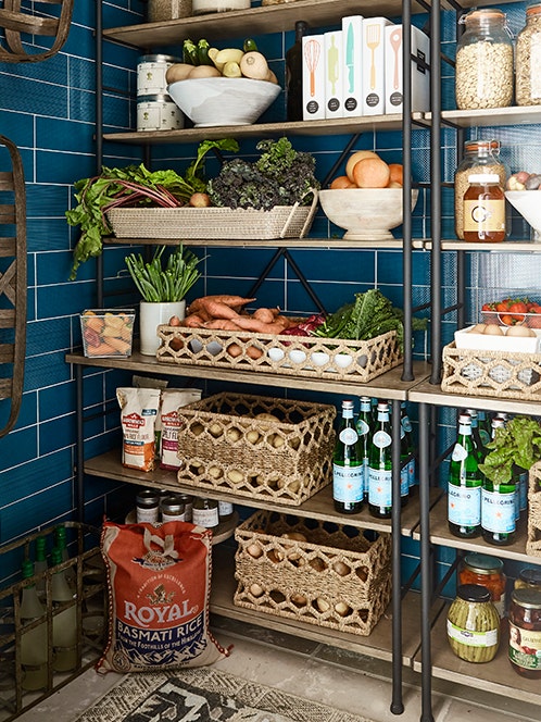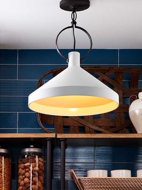 The Limoges Large Pendant by Suzanne Kasler illuminates fresh produce and grains in the cold larder, inspiring a farm-to-table approach to every meal.