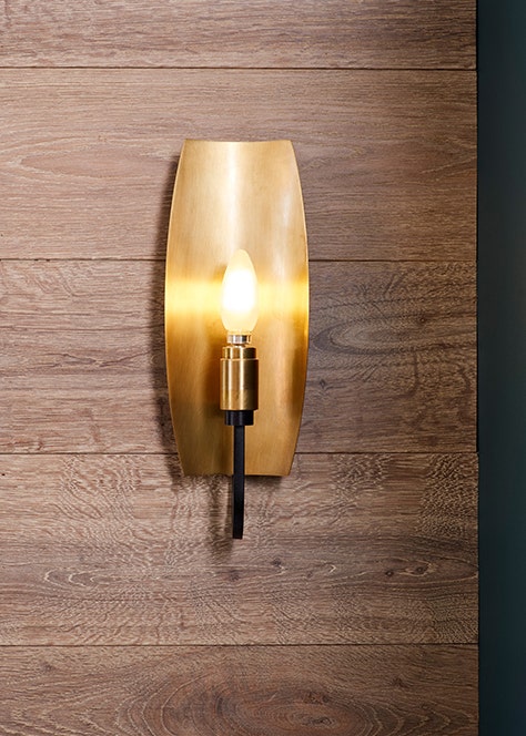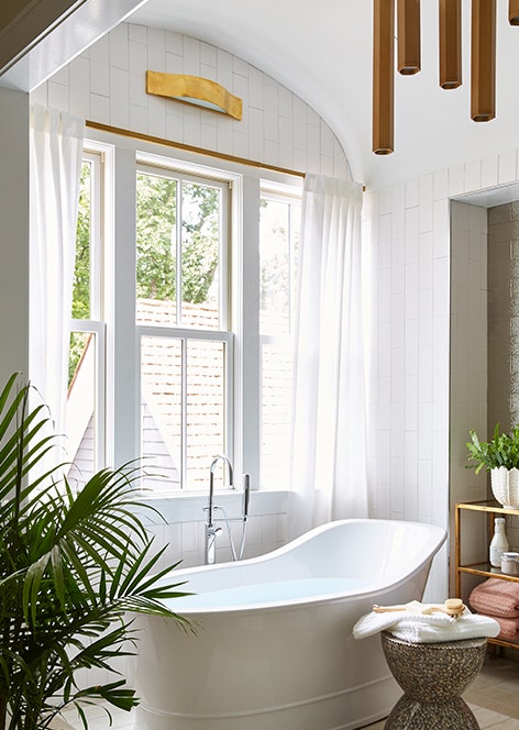Left: The modern curve of the Avant Medium Sconce by Kelly Wearstler elevate the architecture of the barrel-vaulted ceiling above and the standing tub below.Right: The natural Quartz stone of the Halcyon Rectangle Sconce by Kelly Wearstler creates a graceful glow against the Antique Burnished Brass backplate."This is clearly a retreat," Quinn told House Beautiful. "It's ethereal and cloud-like when you're in there."