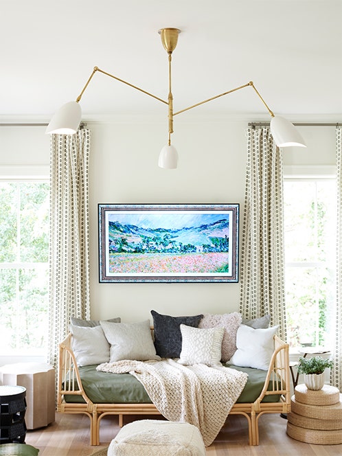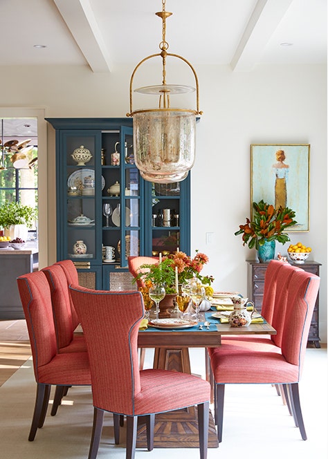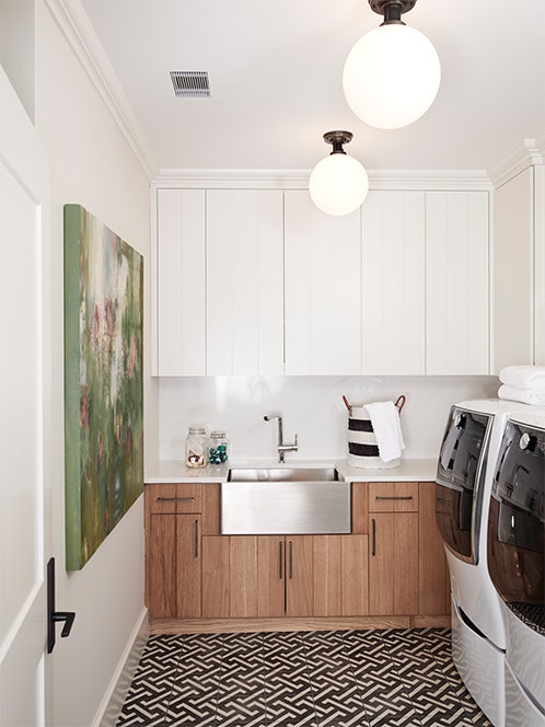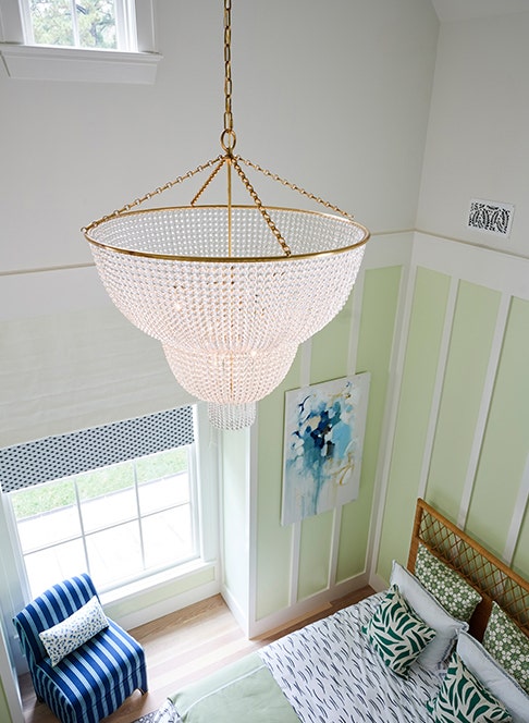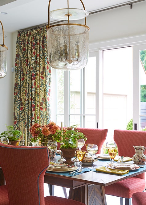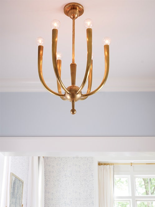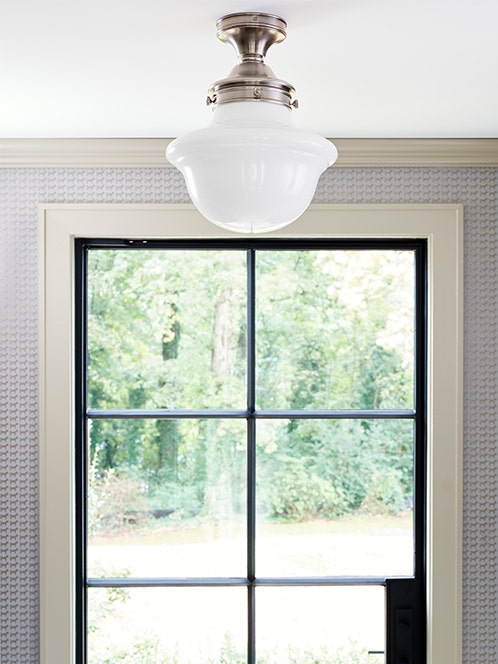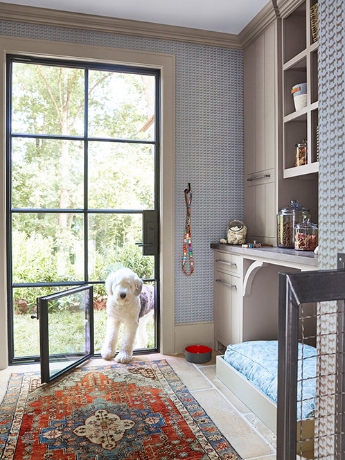 The mudroom was designed to be functional for all family members - especially the furry ones. The custom glass door features a hidden pet entrance. "I love that I could put my pup in here when she's muddy, close the half door, and know she's not behind a closed wall," Hart told House Beautiful. The Edmond Flush Mount by E.F. Chapman illuminates overhead.