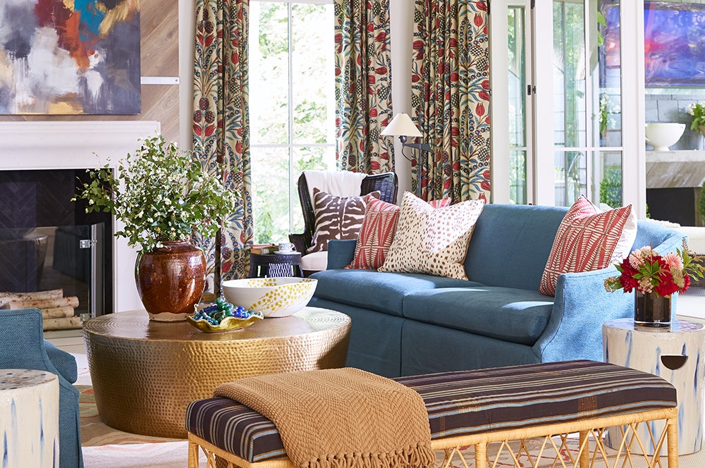 Hart layered warm neutrals, deep crimsons and peacock blues to give depth to the living room, featuring the Hargett Bridge Arm Floor Lamp by J. Randall Powers.