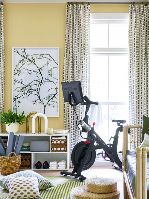 The retro silhouette of the Sommerard Large Triple Arm Chandelier by AERIN extends the invitation to relax after a long day (or workout) in this serene, multi-purpose space.