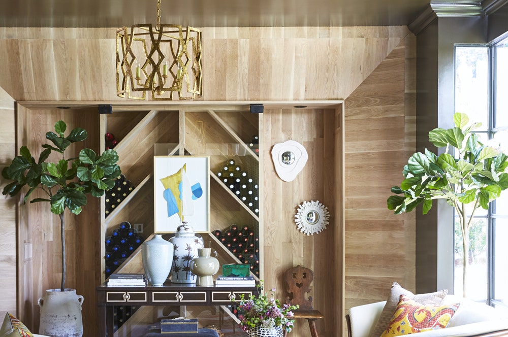 The best part of this grape escape? Stock the custom chevron shelves and you'll never have to leave the house for a great bottle of wine! The Venetian Gold finish of the Brittany Small Lantern by Niermann Weeks provides a sense of ancient luxury, perfect for curating a collected atmosphere in this white-oak paneled lounge.