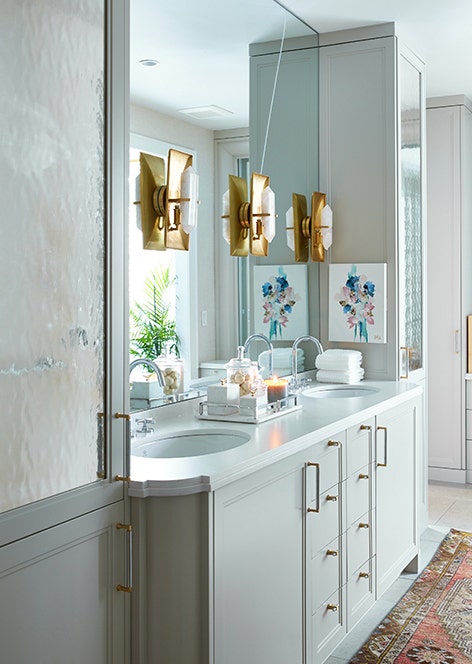Tall ceilings allowed for statement-worthy lighting, including the Jacqueline Two-Tier Chandelier by AERIN. The sleek silhouette of Bryant Sconce in Hand-Rubbed Antique Brass by Thomas O'Brien highlights the clean design of the bathroom.