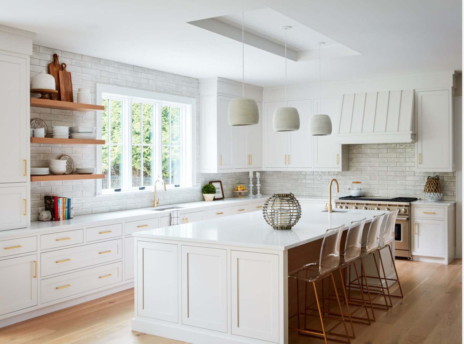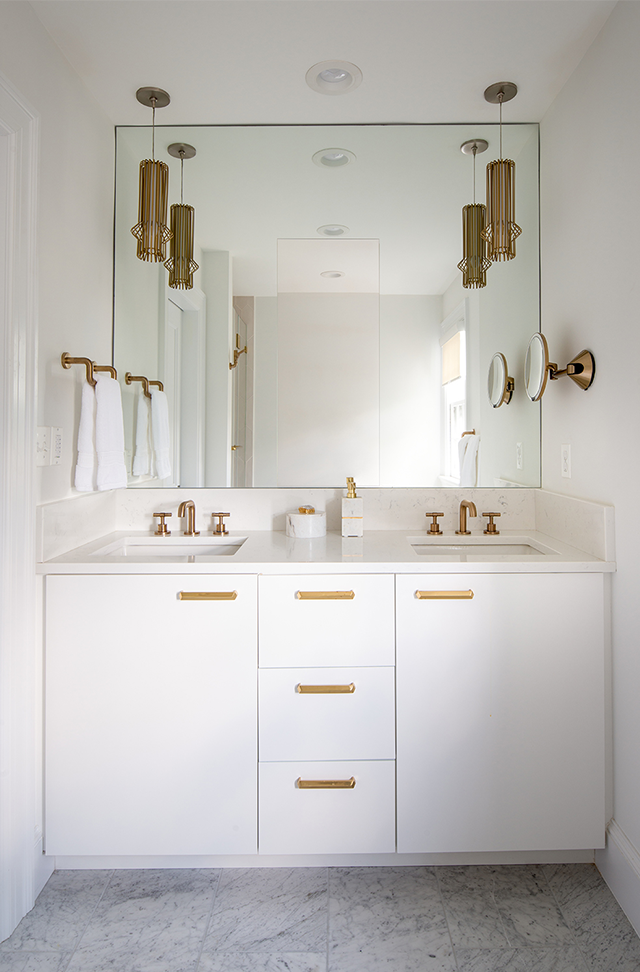 Favorite thing about Circa Lighting: Tech Lighting’s Mina Pendants in brushed gold to accent a navy blue kitchen island.