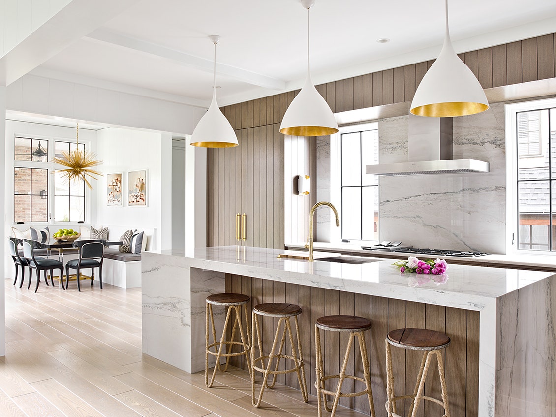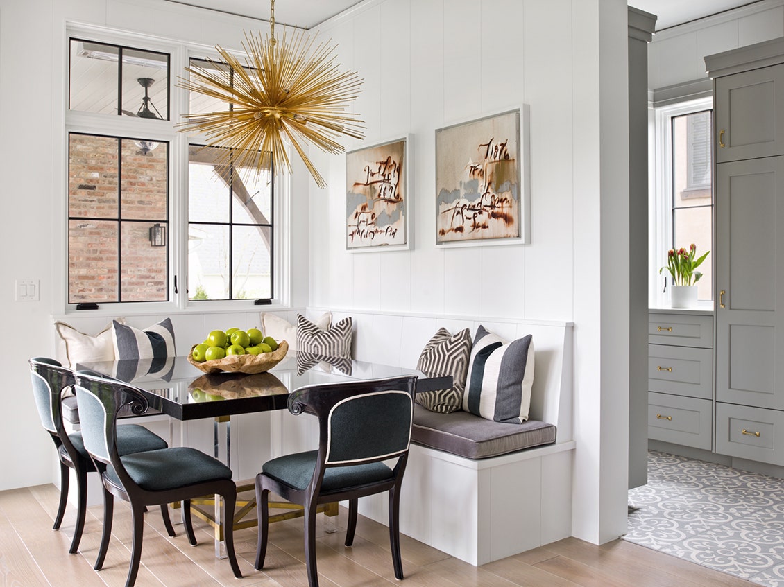 The kitchen's open floor plan allows for a light-filled breakfast nook, creating a cozy destination for friends and family to gather. Radiating with organic style, the Strada Medium Oval Chandelier by Kelly Wearstler evokes modern sophistication above the custom built-in banquette. The chandelier's Gild quills orchestrate delicate warmth in this crisp, cool nook.