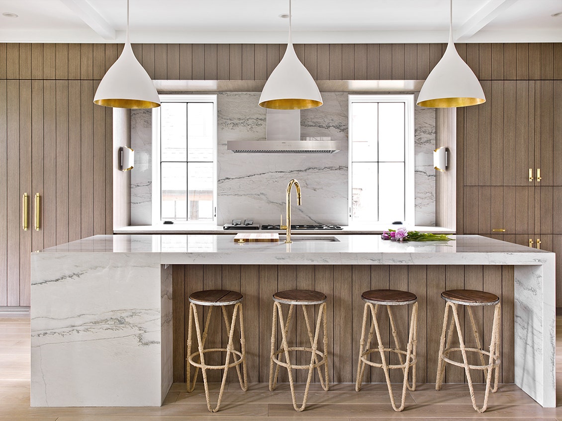 Swathed in neutral tones, this modern kitchen embraces the powerful impact of craftsmanship. A trio of Agnes Pendants in a Plaster White finish by AERIN enhances the kitchen's minimal design. The contrasting Gild interior of the bell-shaped silhouette brilliantly complements the brass hardware throughout the kitchen. A pair of Selfoss Sconces by AERIN were selected - in the same finish as the pendants - to create a feeling of balanced harmony.