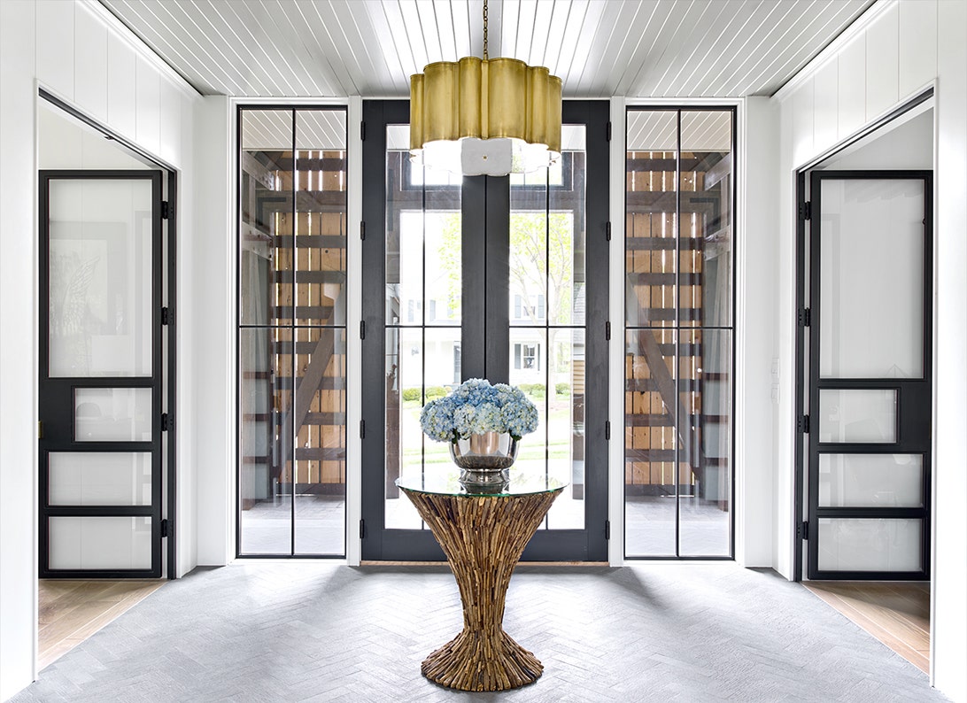 Floor-to-ceiling doors and windows, a painted v-groove ceiling and herringbone floors showcase J. Jordan Homes' exquisite attention to architectural details. The Markos Large Hanging Shade by Alexa Hampton in Natural Brass hangs from above to create a grand entrance.