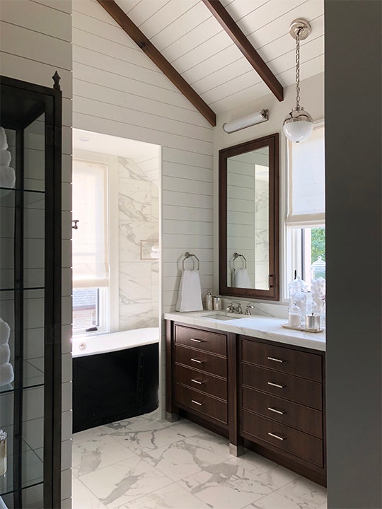 Rich, dark wood offers sharp contrast in this traditional bathroom. The Polished Nickel finish of the Calliope Tall Bath Light by Thomas O'Brien and the Montgomery Small Globe Pendant by Ralph Lauren injects luxurious elegance.