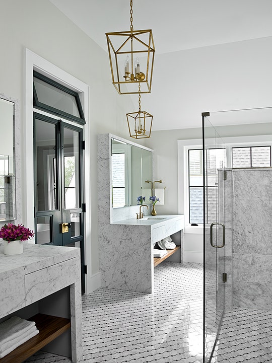 This modern master bathroom is lit by a pair of Darlana Small Lanterns by E.F. Chapman. The warm finish of the open-frame lanterns provides a counterpoint to the monochromatic sanctuary.