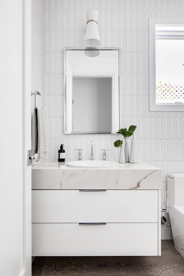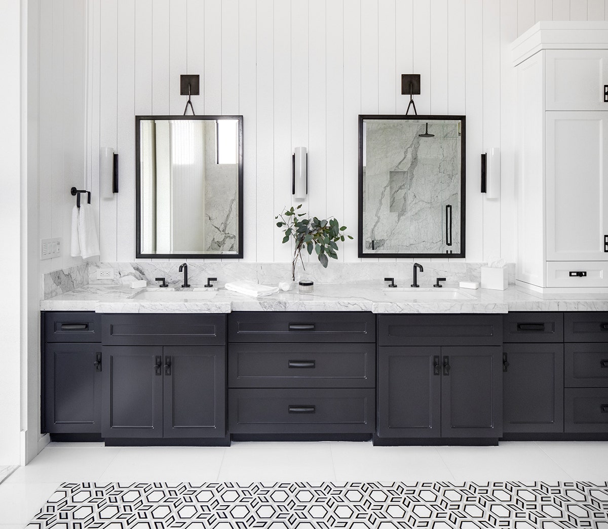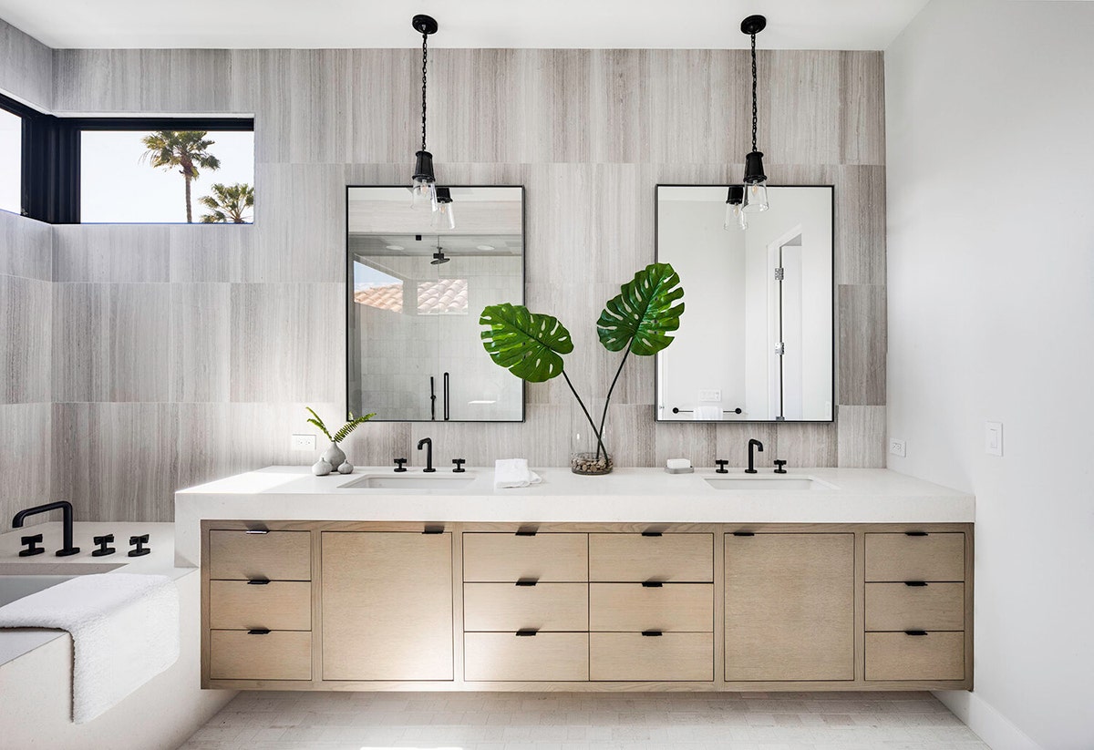 “I love sconces,” Valerie says. Flanking vanity mirrors in a bathroom, sconces can be particularly effective, producing that just-right light that is extra flattering. These Precision Cylinder Sconces by Kelly Wearstler add a sophisticated retro touch to this bold, high contrast bathroom in Newport Beach.