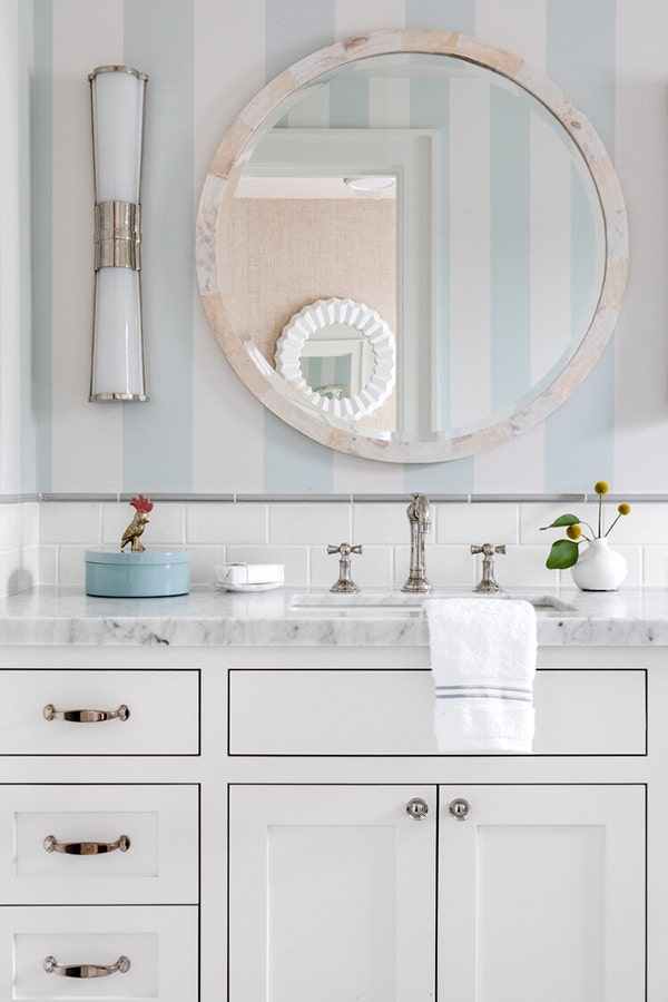 “This client definitely wanted a Cape Cod feel,” Valerie says. “They wanted that East Coast energy.” And nobody does all-American East Coast style better than Ralph Lauren, so naturally, a pair of the designer's Westbury Double Sconces (pictured right) found their way into one of the bathrooms in this waterfront Newport Beach home. “Lighting was one of the very first things we picked for this home,” Valerie says, including the narrow Carew Linear Sconces by Chapman & Myers (pictured left) that elevate this turquoise-and-white striped powder room.