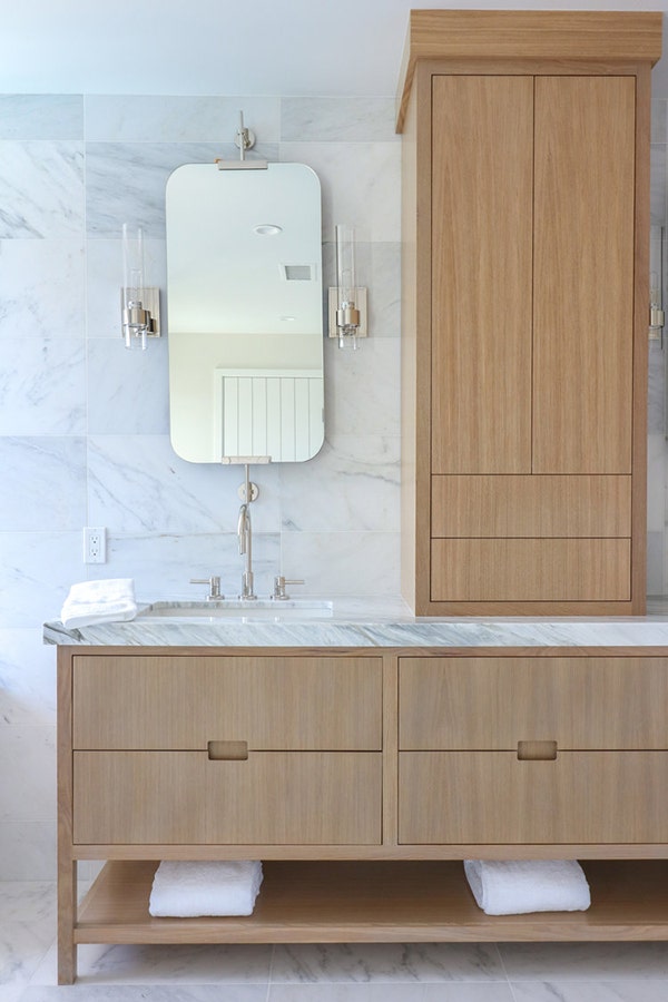 “This particular client wanted a really clean look but not too modern,” Valerie says. To keep the spacious bathroom inviting, Valerie went for natural organic tones with light honey colored cabinetry and stonework shot through with a peaceful, soft gray striation as well as matt-black metal work, including the Robinson Small Pendants by Thomas O'Brien above the vanity, that are particularly pleasing to the eye.