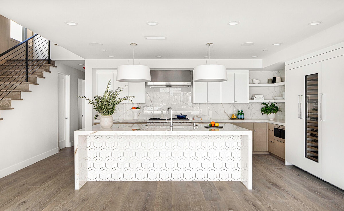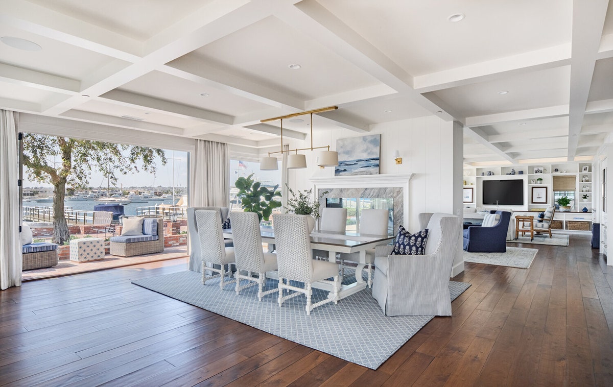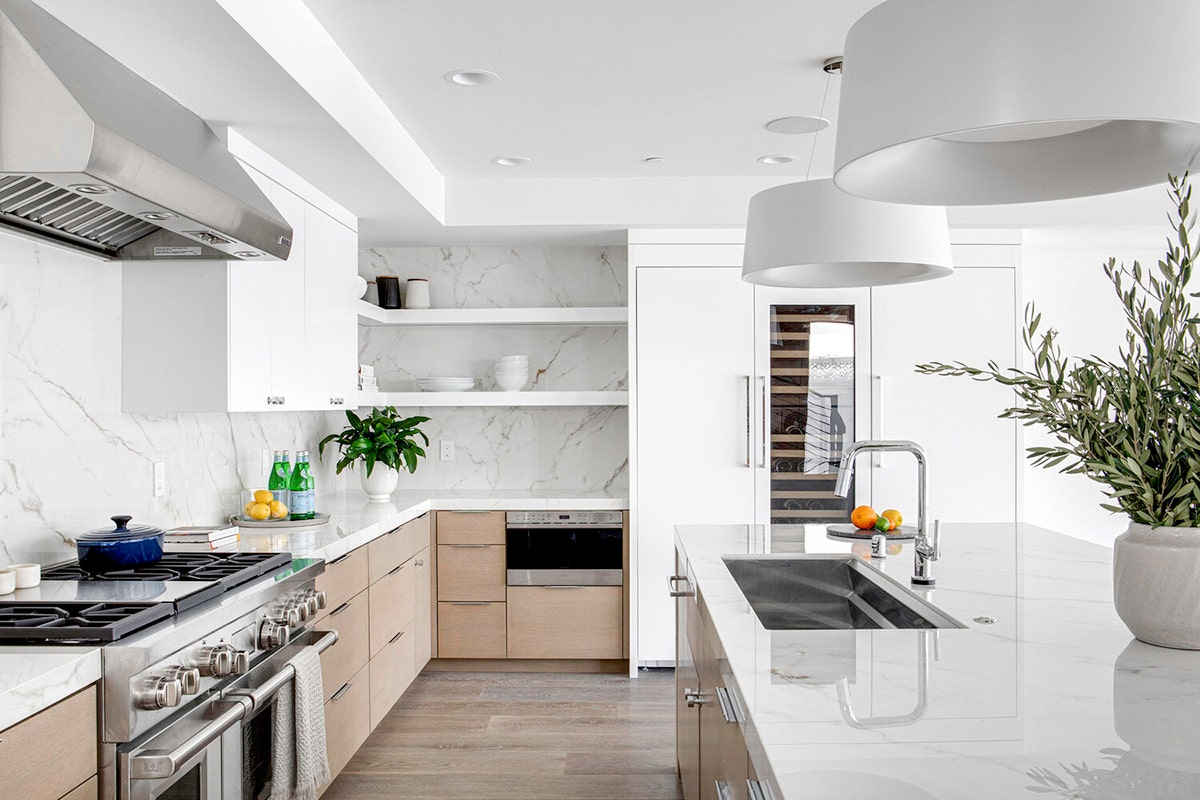 “A lot of homes down on the Newport Beach peninsula are long and narrow, and I was really trying to come up with a way to anchor the space and make it feel like its own area.” The shades make a statement but a quiet one, which appealed to Valerie for this warm coastal kitchen with clean lines, soft light, and gorgeous white oak cabinets.