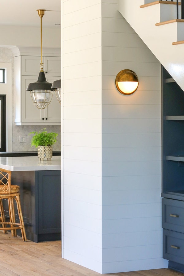 For this young California family, Valerie put a refined spin on the modern farmhouse trend. “I try not to fit into one box,” she says. “The goal is to give a cohesive timeless look to every space.” And when it comes to timeless design it's hard to top the versatility of the Darlana Lantern by Chapman & Myers (pictured left). “It just works with so many different genres and styles,” Valerie says. Above the bar, a Boston Functional Single Arm Library Light by Chapman & Myers (pictured right) adds ageless appeal.