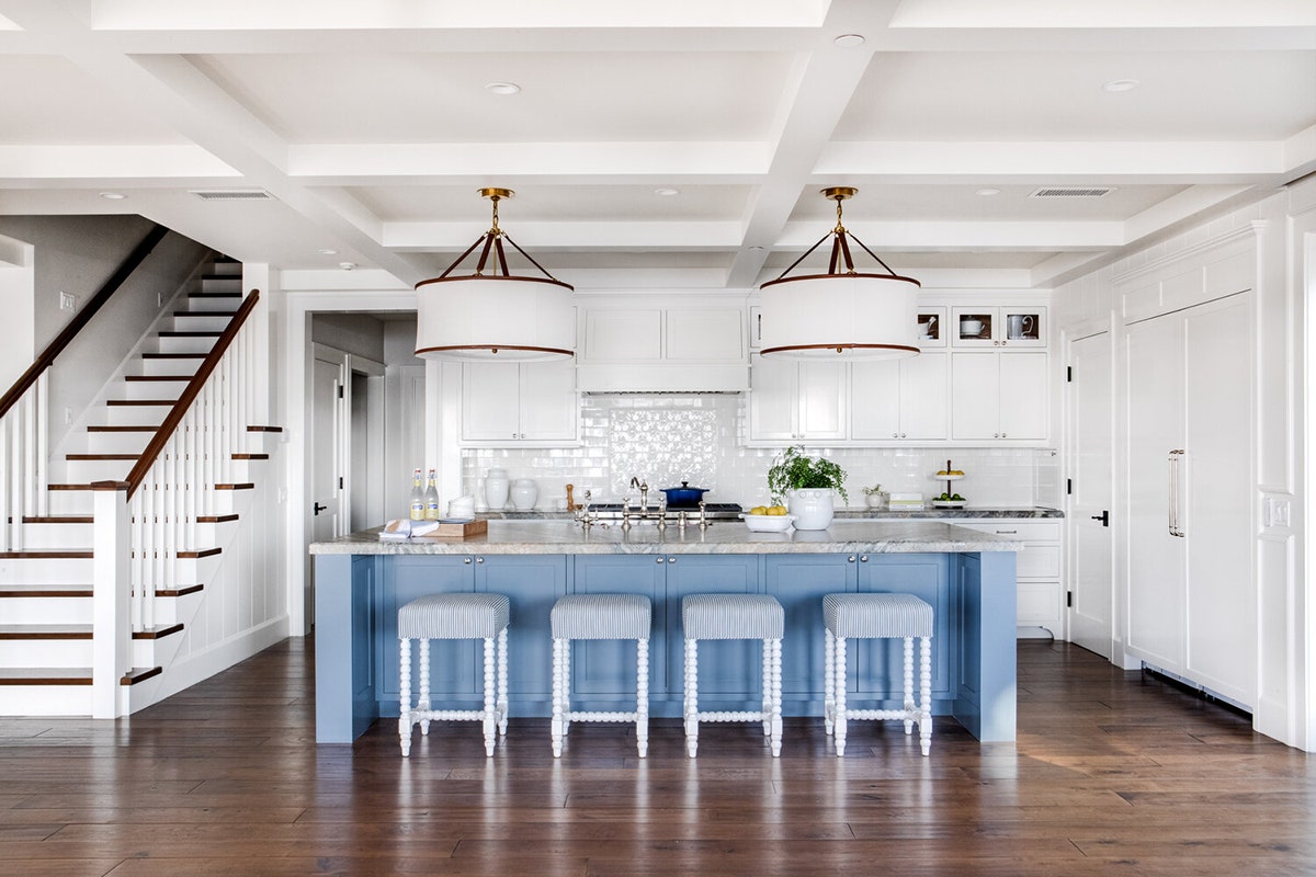 “This is a two lot house that is definitely built for a family,” Valerie says. “All the family members entertain in this home. This is where they gather. There's lots of cooking going on, and they're big wine drinkers. There are two 30-inch-tall wine refrigerators.” A cheerful periwinkle island and a pair of Broomfield Hanging Shades by Ralph Lauren draw the eye and invite friends and family to pull up a stool and pour another glass of wine.