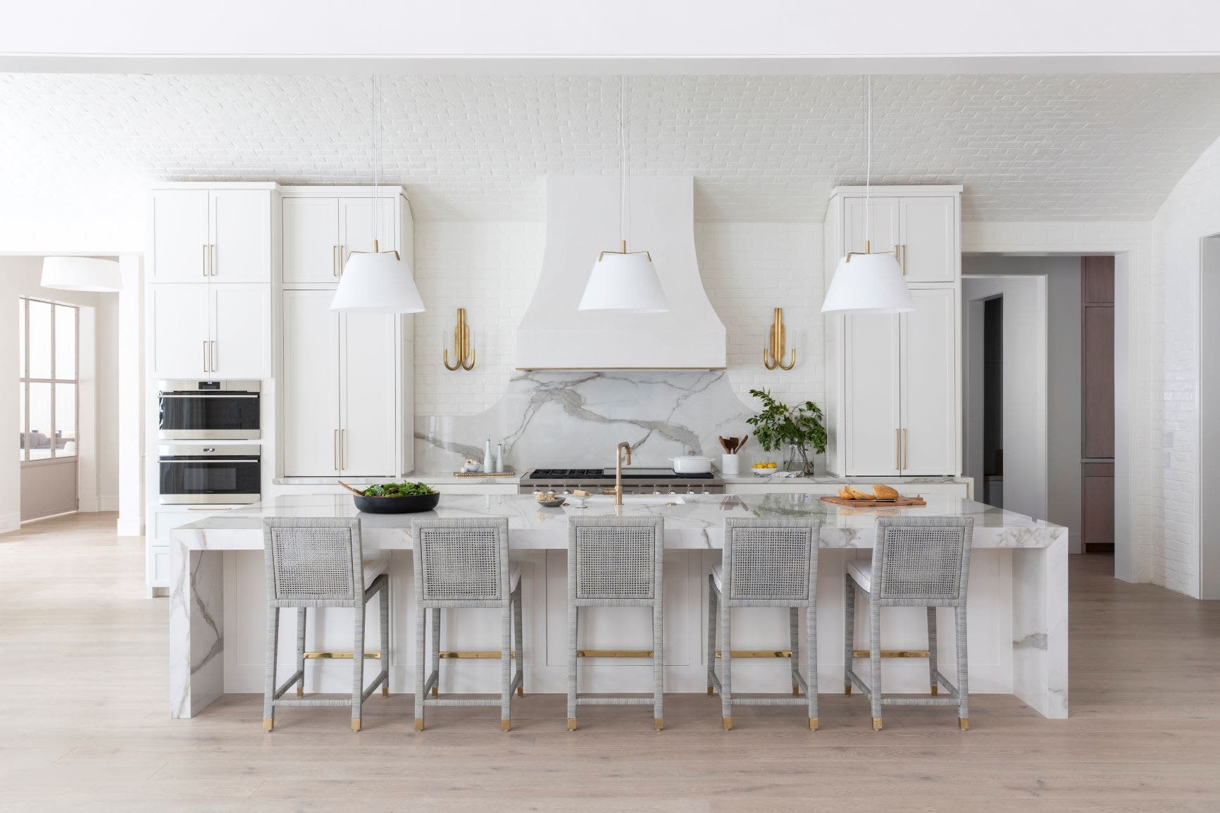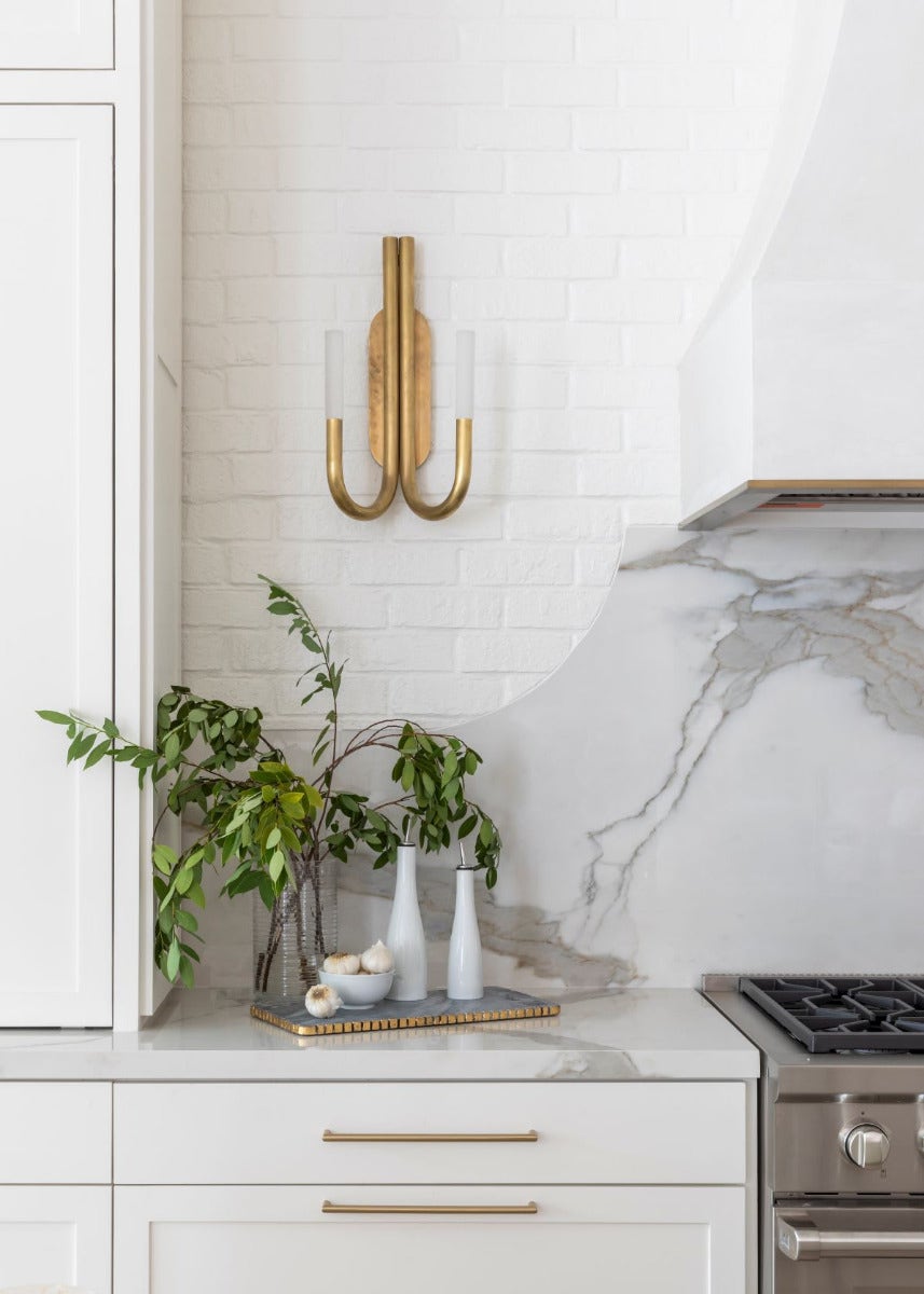 Adding sconces on either side of the range hood creates ambient lighting that softens the brick walls. Situated in an open concept floor plan, these decorative sconces also make the kitchen feel less like a kitchen. The large pendants provide task lighting and illuminate the island.