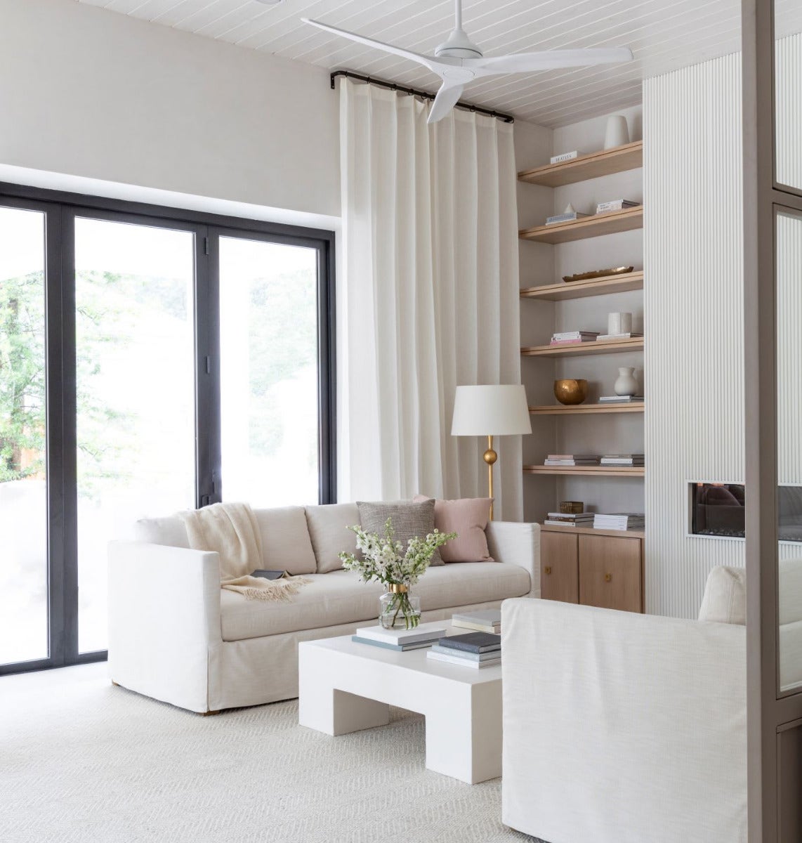 The long and lean, brass floor lamp draws eyes up to the tall planked ceiling and accents the fluted wood surrounding the fireplace in this sunroom.