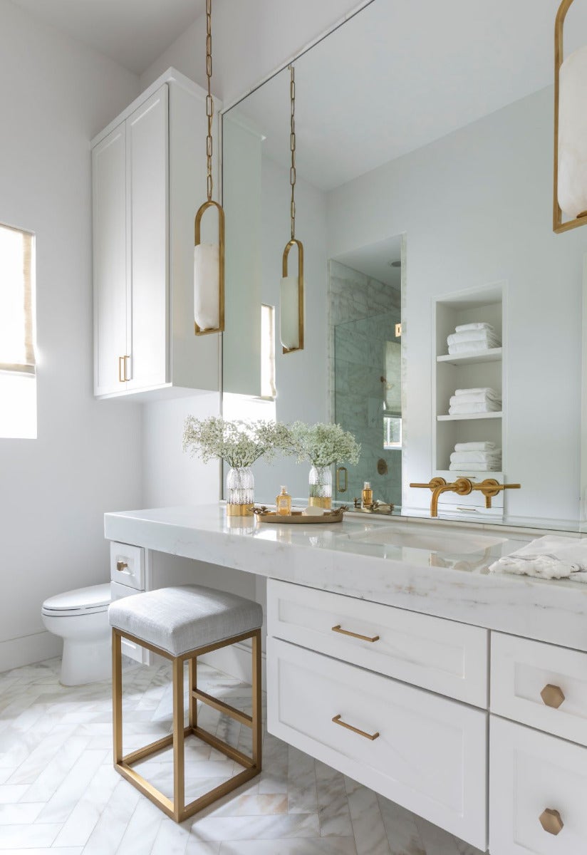 It’s fun to mix things up and one of our goals for this house was to choose lights with eye-catching silhouettes. Pendants, rather than sconces, draw the eyes up to the tall ceilings in this bathroom.