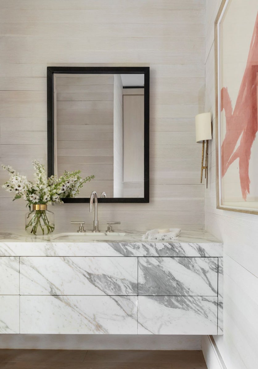 When installing fixtures directly onto reflective surfaces like in this powder room, I select ones with light diffusing shades to avoid overly-bright, hot spots. These alabaster sconces were a beautiful way to achieve this.