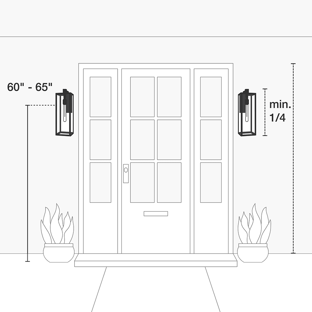 When mounting exterior wall lights beside a door, position the fixtures at eye level, or 60"- 65" from the ground. For the best spread of light, the fixture should measure at least 1/4 the height of the door..