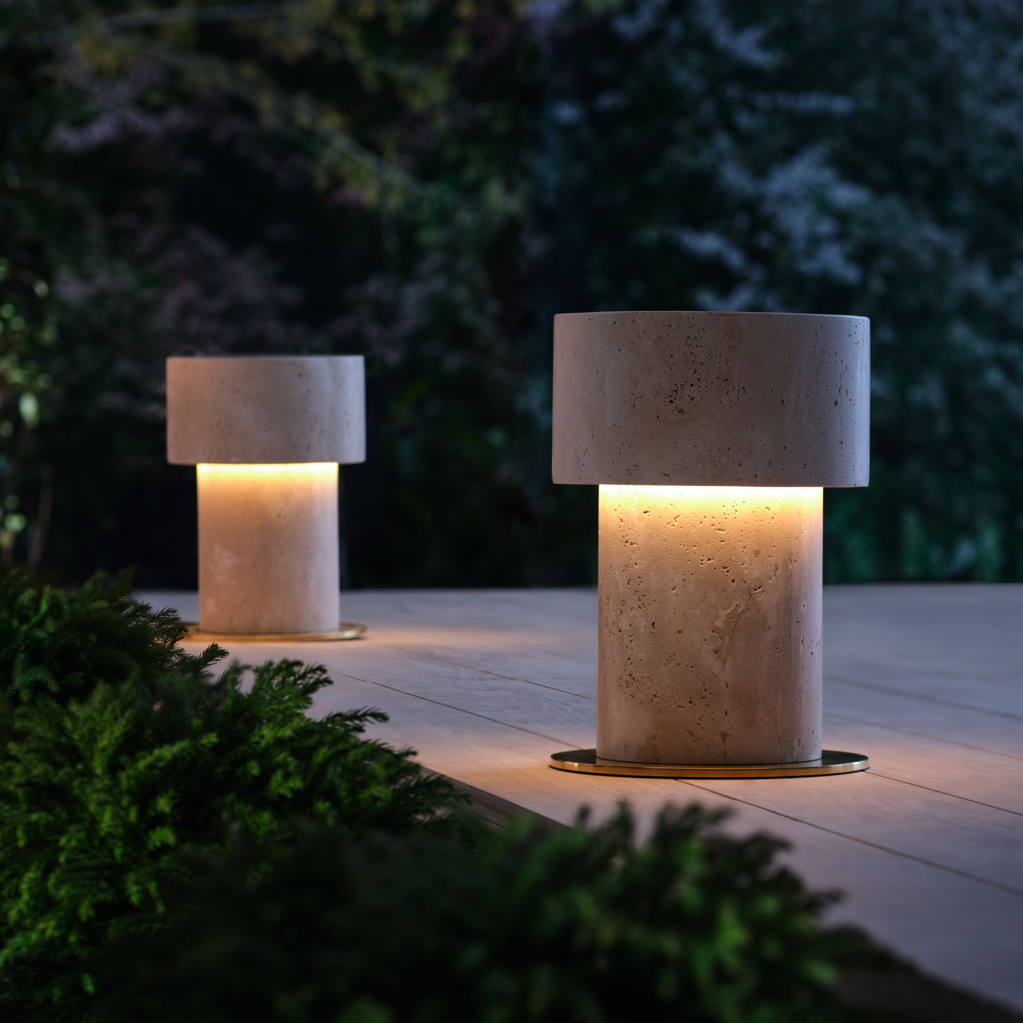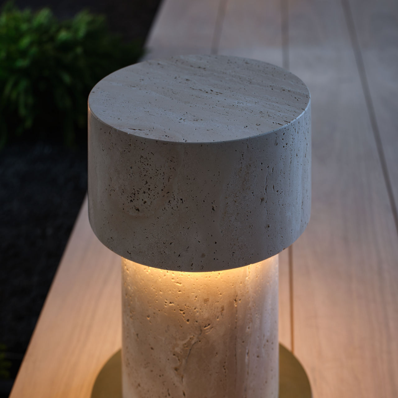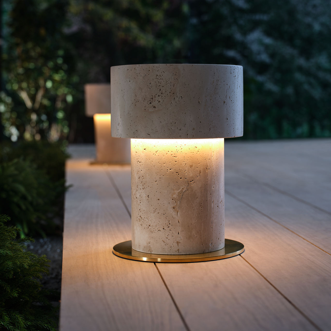 The Rayul pathway light features a sleek travertine design with a flat top, offering a modern, architectural aesthetic. Its clean lines and refined form evoke the elegance of sculptural furniture, adding sophistication and functionality to outdoor spaces.