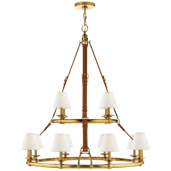 “The contrast between leather and metal on the Westbury Double Tier Chandelier by Ralph Lauren in Brass expertly toes the fine line between classic and fresh.”