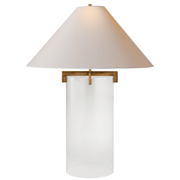 “The coolie shade, clear cylindrical base and clean and modern lines of the Brooks Table Lamp juxtapose beautifully when paired with an antique patinaed table.”