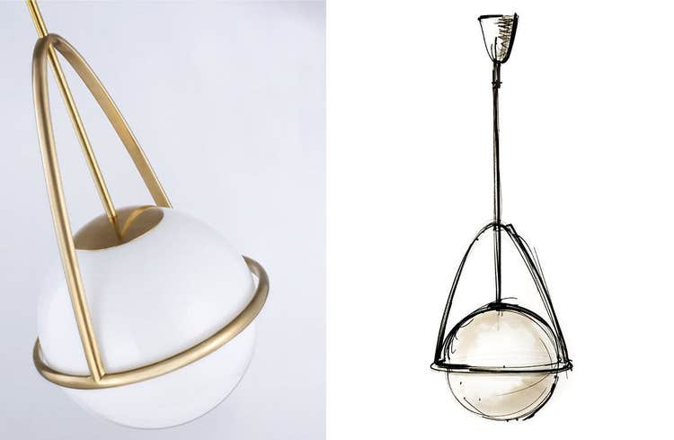 A globe light with vintage origins, Lisette provides a contemporary, deconstructed interpretation of a caged glass fixture. The modernist design features a spare, elliptical brass armature intersecting with a band around a mouth-blown cased white glass globe. The orbital curves of the frame seem all of one piece, with a mid-century, sleek aerodynamic character. The milky glass for the globe assures a warm, easy character of light overhead. Used as a sole pendant or in multiples, the fixture offers a stylish focal point in the living room, above the dining table or breakfast bar; and in entrances, lobbies and corridors where a bold impact is desired.