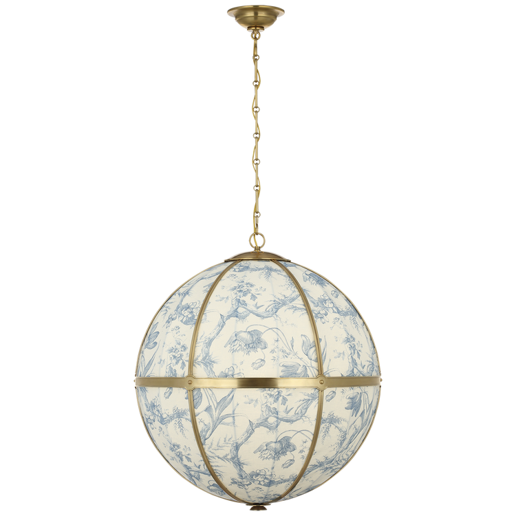 Allister 24" Framed Globe Chandelier in Hand-Rubbed Antique Brass with Schumacher Delft Toile De Fleurs