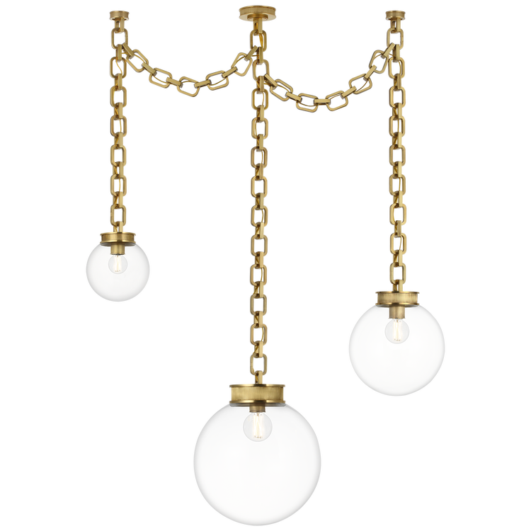 Bellamy 3 Light Statement Chain Multi Globe Chandelier in Soft Brass with Clear Glass
