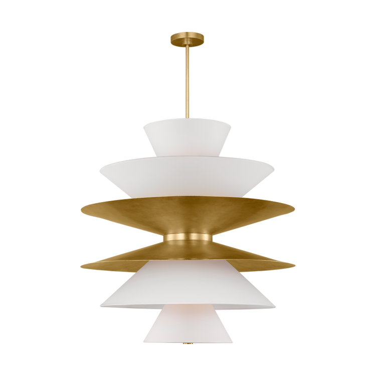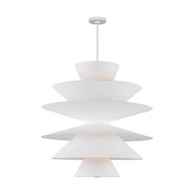 Designed by Christine Lemieux, the Chambord Grand Pendant features a series of cascading, cone-shaped shades made from white paper, offering a gentle, diffused light. The sculptural design is complemented by a choice of finishes—Gild, Cast Plaster, or Aged Iron—adding a tactile richness to its bold form. Damp-rated for added versatility, this pendant balances clean lines with a sense of craftsmanship, making it an exquisite addition to both contemporary and classic interiors.