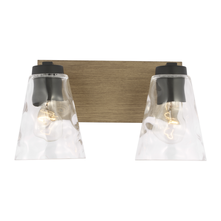 The Dunton Medium Vanity features two evenly spaced glass shades set against a faux wood backplate, supporting horizontal installations over medium-width sinks or mirrors. Its symmetrical layout and open bulb visibility offer both functional clarity and rustic character.