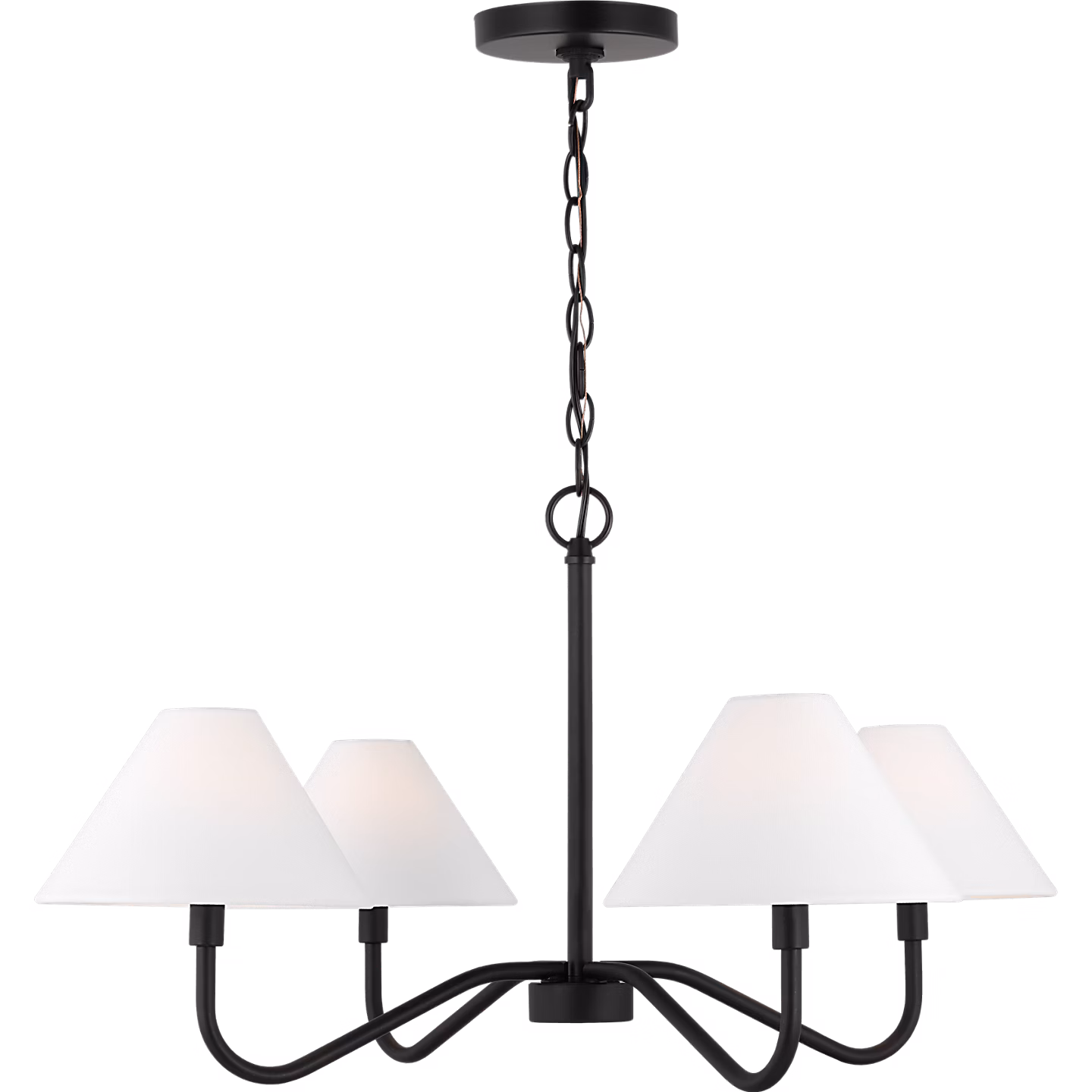 The Eldon Medium Chandelier by Drew & Jonathan combines refined classic charm with modern simplicity. Featuring four artfully curved arms crowned with white linen empire shades, this chandelier brings warmth and elegance to any space. Its thoughtful design includes a circular top loop, chain suspension, and a clean, minimalist canopy, creating a cohesive look that’s both inviting and versatile. Available in Midnight Black and Satin Brass finishes, the damp-rated Eldon is perfect for transitional, farmhouse, or contemporary interiors, enhancing dining rooms, kitchens, or entryways with its soft, ambient glow.