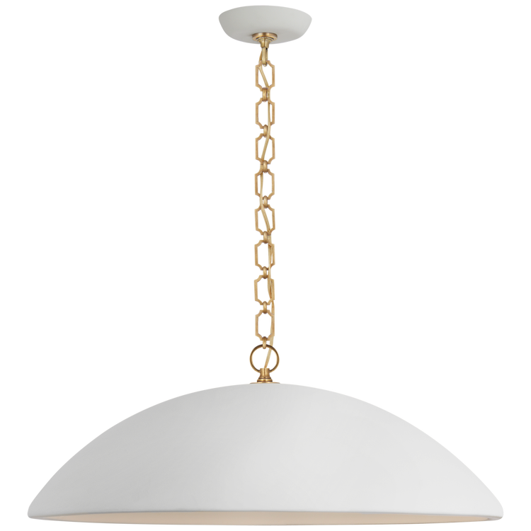 The sculptural Elliot by Suzanne Kasler presents a rugged-yet-refined silhouette in lightweight concrete. The unexpected material's smooth, inverted dome hangs from a slender chain and casts a light that's ideal over kitchen islands or dining room tables.