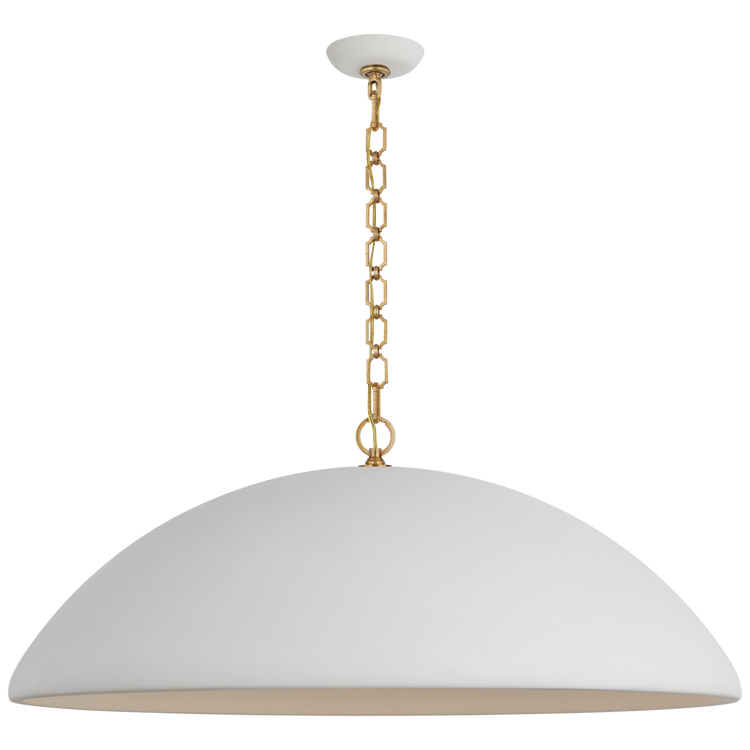 The sculptural Elliot by Suzanne Kasler presents a rugged-yet-refined silhouette in lightweight concrete. The unexpected material's smooth, inverted dome hangs from a slender chain and casts a light that's ideal over kitchen islands or dining room tables.