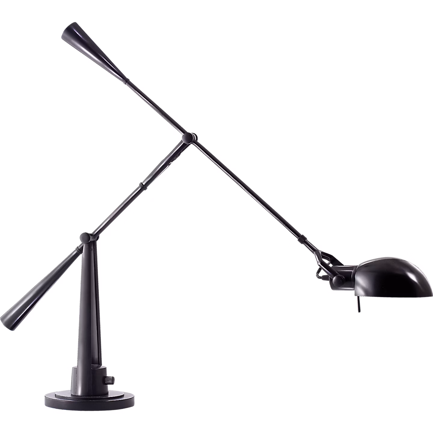 The sculptural Equilibrium by Ralph Lauren honors its name with masterful balance and mobility. A boom arm in matte black or polished nickel pivots at the base and shade, allowing unlimited illumination possibilities in either modern or traditional reading areas.