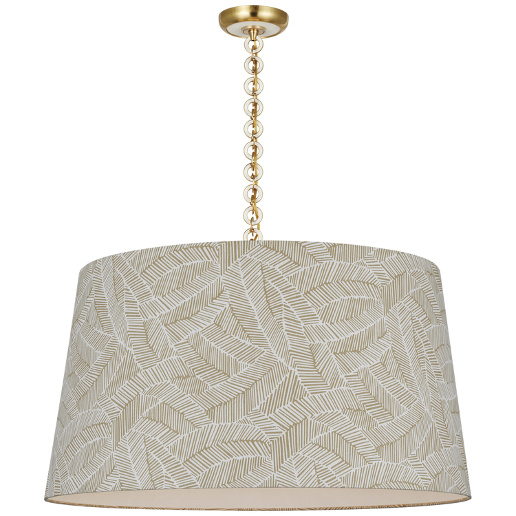 Evelyn 33" Hanging Shade in Hand-Rubbed Antique Brass and White Oak with Schumacher Taupe Abstract Leaf Shade