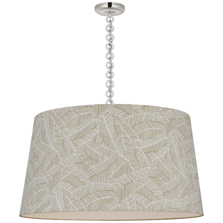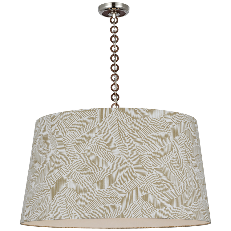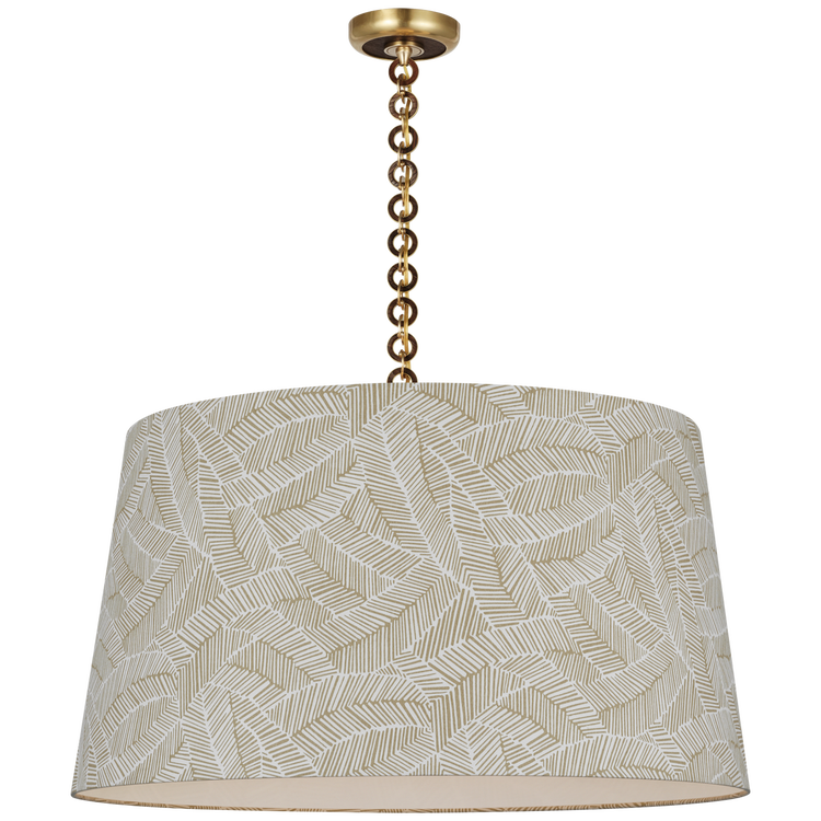 Evelyn 33" Hanging Shade in Hand-Rubbed Antique Brass and Natural Oak with Schumacher Taupe Abstract Leaf Shade