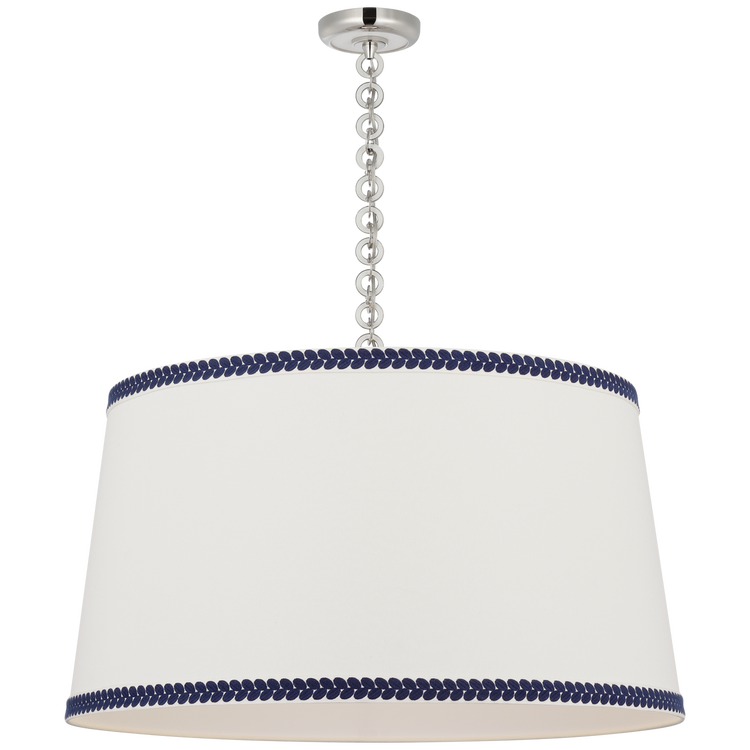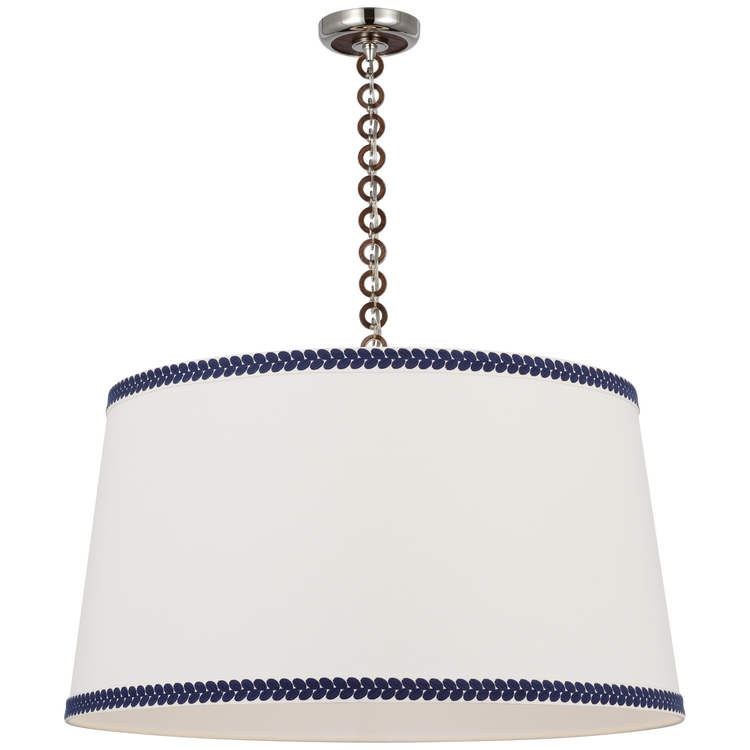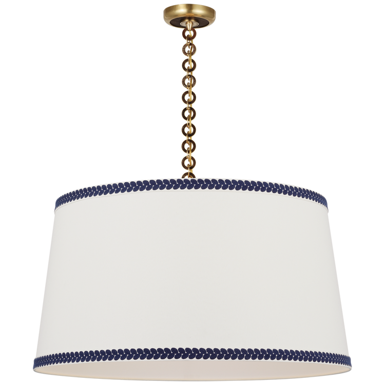 Evelyn 33" Hanging Shade in Hand-Rubbed Antique Brass and Natural Oak with Linen Shade and Schumacher Blue Berkeley Tape