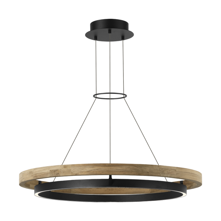 Concentric rings create a modern statement in the Grace outdoor chandelier. The larger outer ring of the 36" Chandelier is made with solid teak wood that will patina over time, creating a weathered, silvered finish ? an inherent quality of teak. An inner ring in our Nightshade Black finish features integrated upward- and downward-facing LED lights, casting a bi-directional glow for exterior illumination.