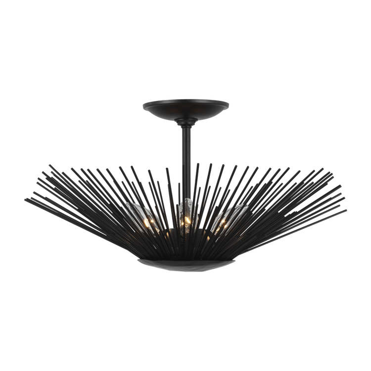 Helios is the Greek God of the Sun. Taking shape from its name, the Helios flush mount features a dynamically cut, sun-like form and gilded iron finish.